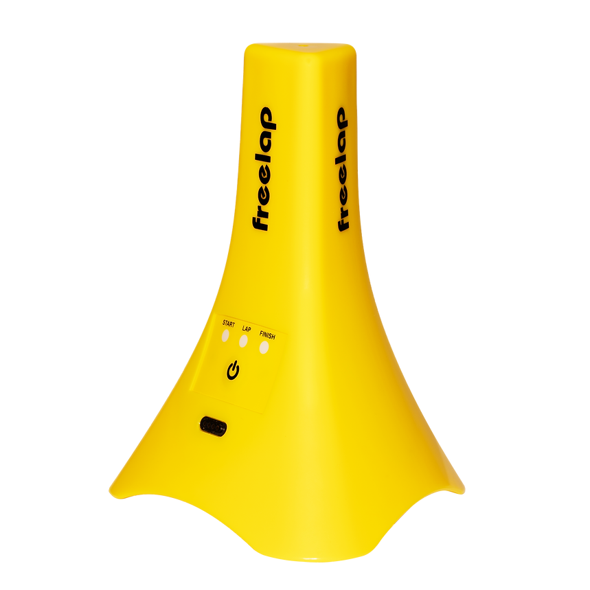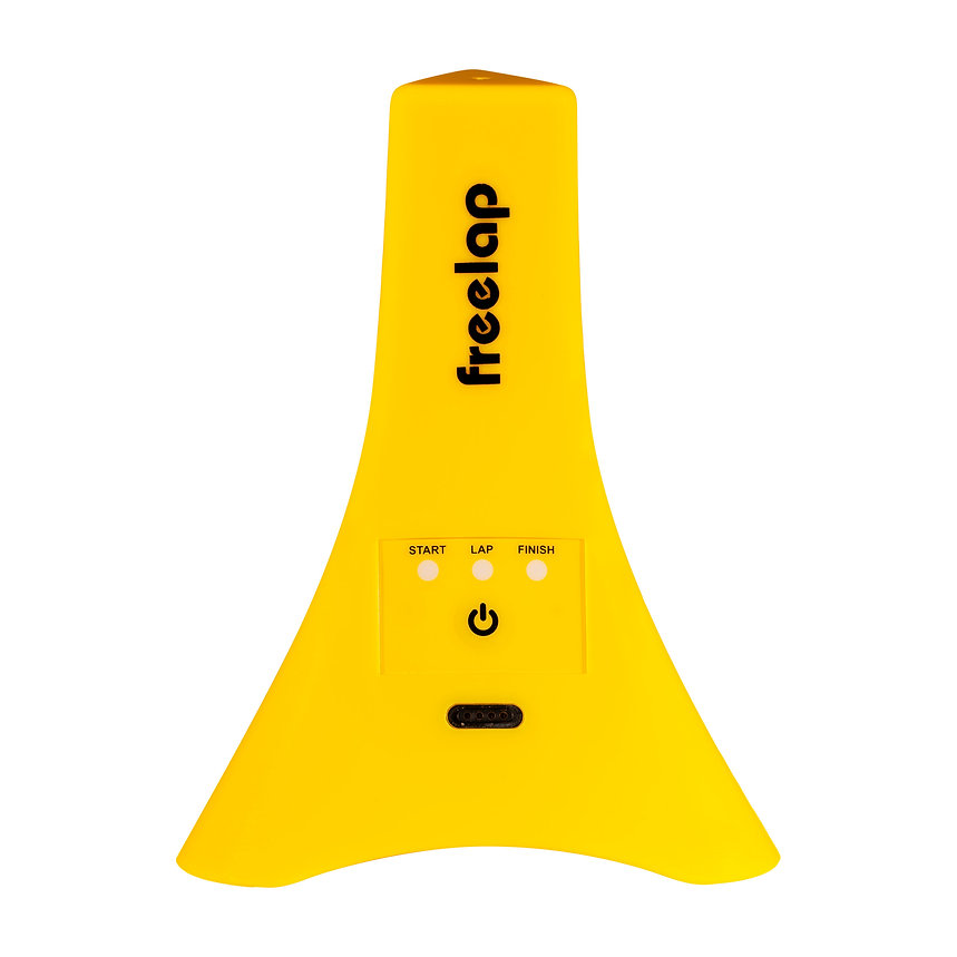 The Freelap Tx Junior Pro transmitter emits a magnetic field that triggers the Freelap FxChip or Fx Chip BLE when athletes run past it.